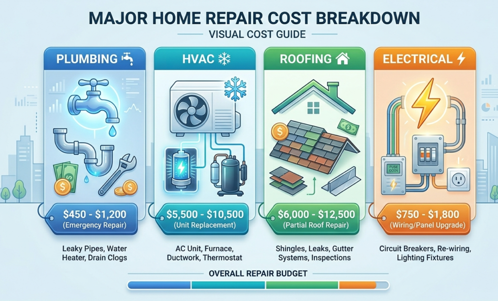 | Roofing | Minor Leak Repairs | $400 to $1,200 | Early fixes prevent major damage |